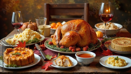 A rustic wooden table laden with a delicious Thanksgiving feast, including roasted turkey, stuffing, mashed potatoes, gravy, cranberry sauce, and pumpkin pie , abundant, green