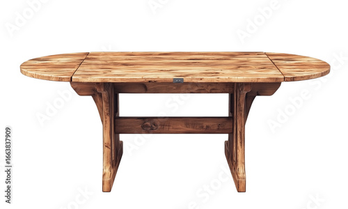 A rustic wooden table with an oval top and sturdy legs, showcasing natural wood grain and craftsmanship.