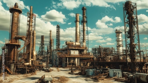 A Rusty, Abandoned Industrial Complex Under a Cloudy Sky
