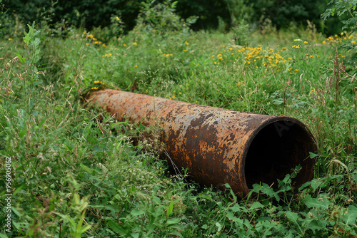 A Rusty Remnant: A weathered metal pipe rests forgotten in a field of verdant life, a silent testament to time's passage.