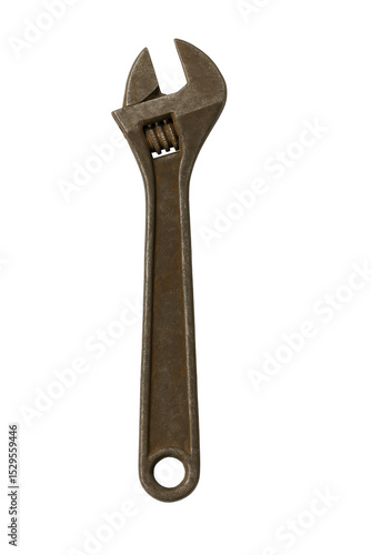 A rusty wrench is shown on a white background. The wrench is bent and has a worn appearance. Concept of wear and tear, as well as the passage of time