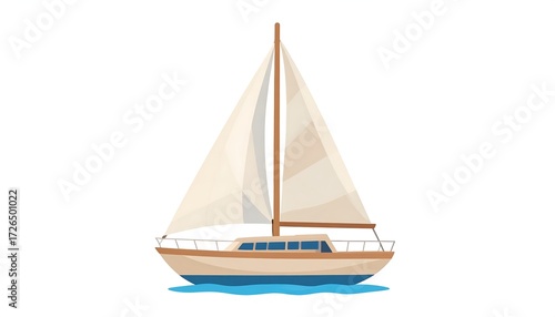 A sailboat with beige sails and hull, blue waterline, floats on a white background