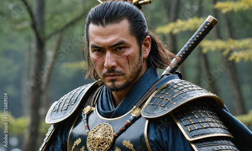 A samurai warrior stands in a forest, his face hardened with determination