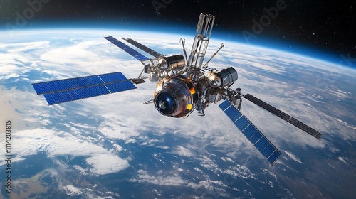 A satellite floating in the vastness of space, detailed with solar panels and antennas. Below, visible, showing vibrant blue oceans, swirling white clouds, and hints of green and brown continents.