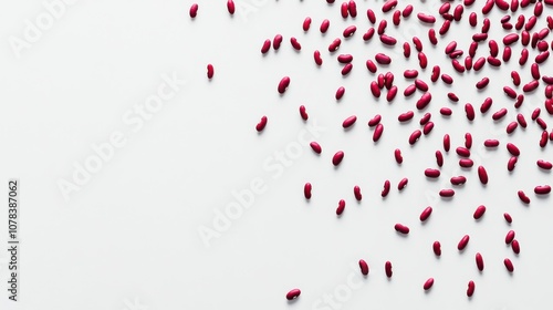 A scattering of red beans on a white surface, highlighting their color and texture.