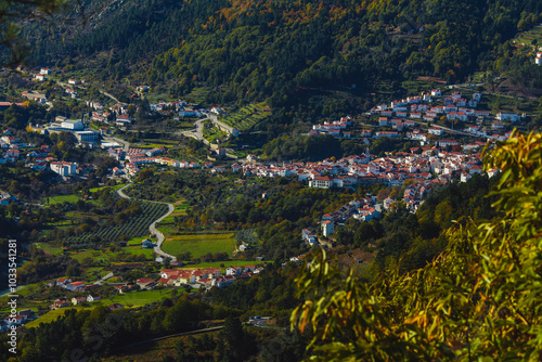 a scenic view of a small village nestled in a valley surrounded by green fields, olive groves, and forests