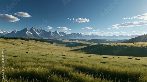 A scenic view of a vast green field with snow-capped mountains in the distance.