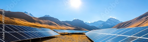 A scenic view of solar panels in a mountainous landscape under a bright sun, illustrating renewable energy and nature.
