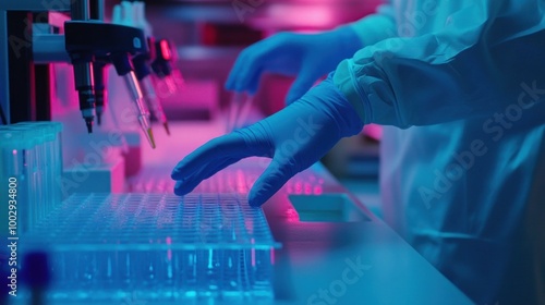 A scientist in gloves conducting experiments in a laboratory with pipettes and test tubes.