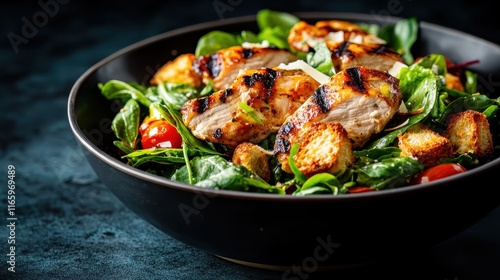 A scrumptious grilled chicken salad resting in a stylish black bowl, featuring vibrant ingredients like spinach, cherry tomatoes, and savory croutons, perfect for a healthy meal.