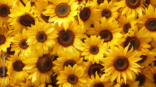 A sea of sunflowers, with vibrant yellow petals and deep brown center flowers, arranged in an artistic pattern. The background depicts a sunny day, creating a cheerful atmosphere
