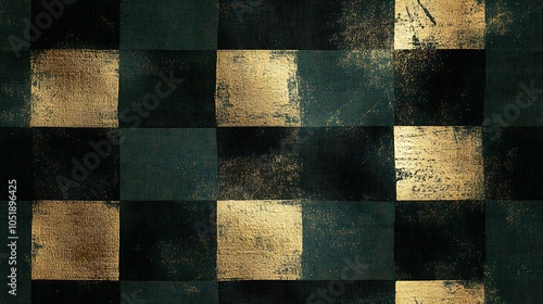 A seamless gingham pattern with metallic gold and silver brush strokes layered over a dark green gingham background, creating a luxurious effect, hd quality, textured look, textile design,
