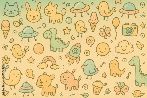 A seamless pattern featuring whimsical, doodle-style illustrations on a gradient background transitioning from green to beige