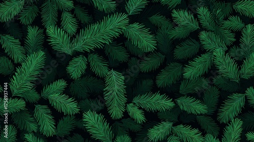 A seamless pattern of Christmas fir tree branches set against a green backdrop is ideal for festive designs and projects