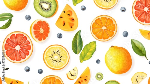 A seamless pattern of fresh fruits like oranges, grapefruits, kiwi, and lemons.