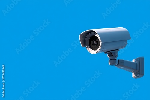 A security camera mounted on a wall against a bright blue background providing surveillance and safety