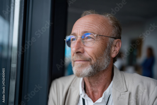 A senior man wearing glasses gazes thoughtfully out a window, his expression revealing a deep sense of reflection and understanding of life's complexities and beauty.
