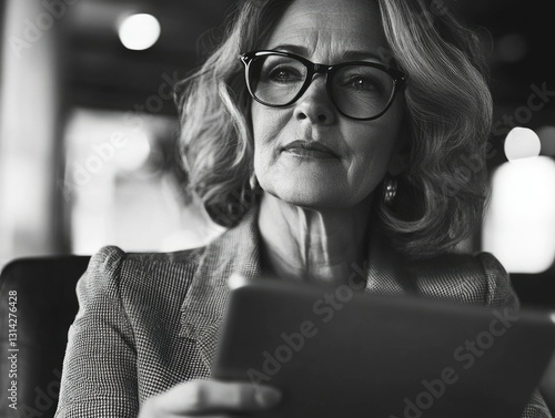A senior woman, dressed in a business suit and glasses, is captured while engrossed in reading from her tablet computer at a cafe. The image evokes themes of technology, productivity, business, and