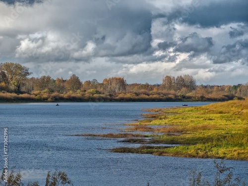 A serene autumn landscape of a wide river with a dramatic, cloudy sky and yellow grass