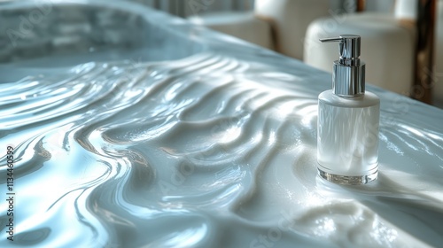 A serene bathroom scene featuring a pump bottle on a smooth, wavy surface.