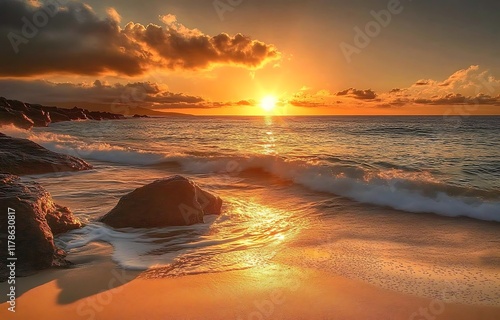 A serene beach at sunset, with waves gently lapping against the shore and rocks.