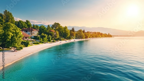 A serene beach scene featuring araffes near the shore, with a house visible in the distance, creating a tranquil coastal atmosphere.