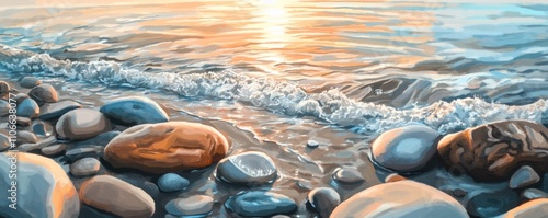 A serene beach scene with smooth stones and gentle waves reflecting the sunset.