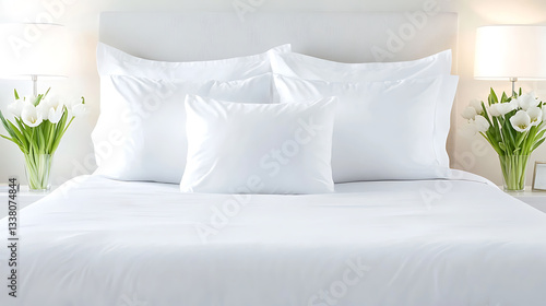 A serene bedroom scene featuring a neatly made bed with white pillows and fresh tulips, creating a calm and inviting atmosphere