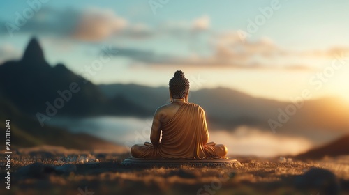 A serene Buddha statue, surrounded by nature, reflecting peace and tranquility at sunrise over majestic mountains.