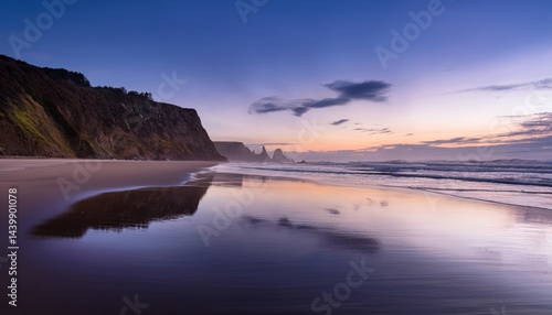 A serene coastal landscape at sunset with cliffs, calm waves, and a reflective sandy beach under a colorful sky.