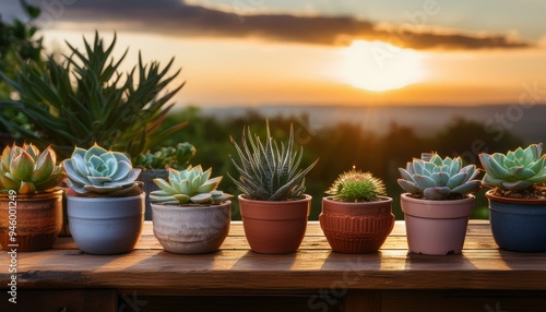 A Serene Collection of Potted Succulents on a Rustic Wooden Table at Dusk