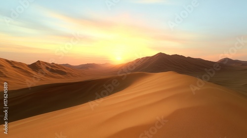 A serene desert landscape at sunset with rolling sand dunes.