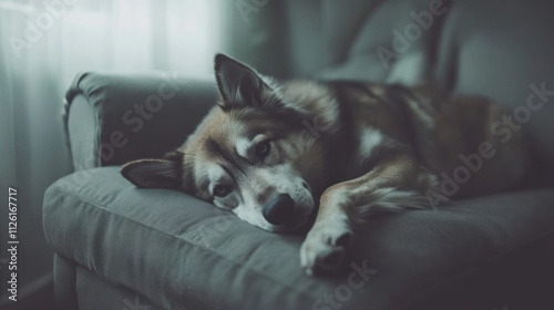 A serene dog resting on a couch, exuding calm and comfort in a cozy environment.