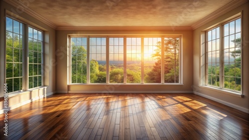 A serene, empty room with a single, large window frame, blurred outside view, warm natural light, and a subtle sense of contemplation.
