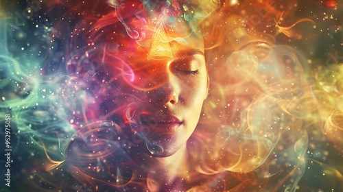 A serene figure surrounded by colorful, swirling patterns representing mindfulness and inner peace.