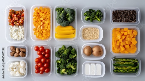 A serene flat lay of meal prep ingredients and portioned containers