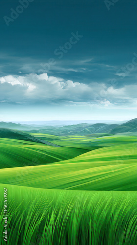 A serene green landscape unfolds with rolling hills, lush grass, and a vibrant blue sky dotted with fluffy clouds creating a peaceful and inviting vista so idyllic.
