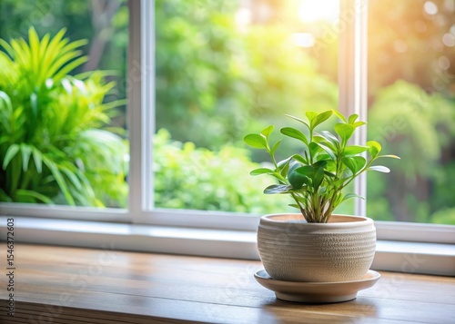 A serene green plant grows in a minimalist ceramic pot on a low table near a window with soft natural light pouring in