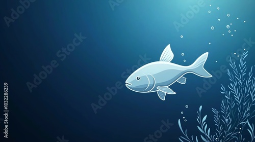 A serene illustration of a fish swimming gracefully through deep blue water, surrounded by bubbles and aquatic plants.