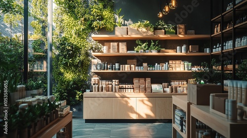 A serene interior of a modern wellness shop filled with greenery and natural light in a bright and welcoming space