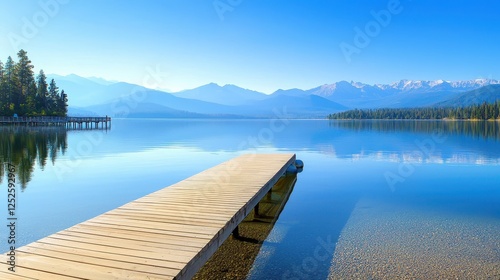 A serene lake surrounded by mountains, with a wooden pier extending into the calm water.