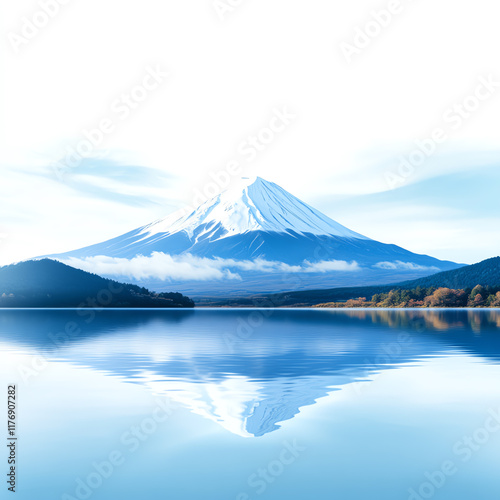 A serene landscape featuring a majestic mountain and tranquil water reflecting its beauty, evoking peace and wonder.