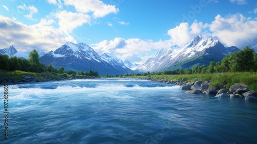 A serene landscape featuring a tranquil river surrounded by majestic mountains and lush greenery under a bright blue sky, Ideal for travel brochures, nature-themed articles, and relaxation imagery,