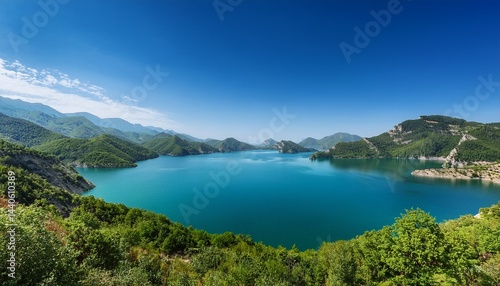 a serene landscape featuring a vast body of blue water surrounded by lush green mountains under a clear blue sky