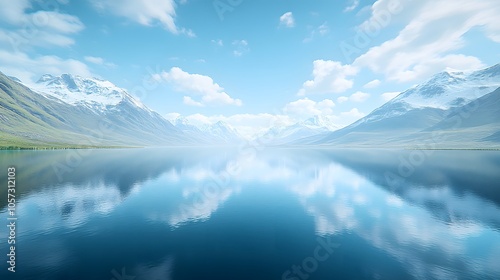 A serene landscape featuring mountains reflected in a calm lake under a clear blue sky.