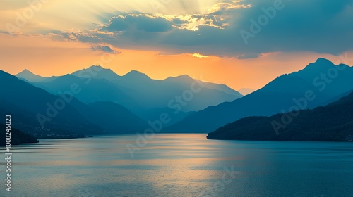 A serene landscape showcasing mountains and a tranquil lake at sunset, highlighting nature's beauty and calmness.