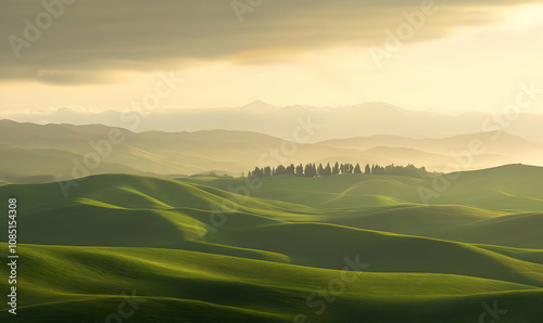 A serene landscape with rolling green hills and a distant cluster of trees under soft light.