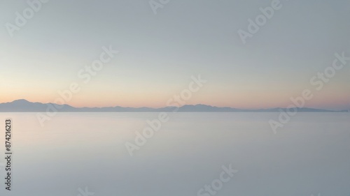 A serene minimalist landscape at dusk with soft pastel colors, featuring distant mountains and a tranquil, reflective foreground.