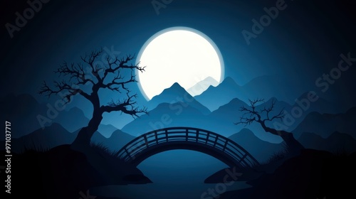A serene moonlit landscape featuring a bridge, silhouetted trees, and majestic mountains under a glowing full moon.