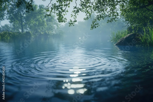 A serene morning scene by a tranquil lake, where gentle ripples disturb the calm water surface, surrounded by lush greenery and soft mist, evoking a peaceful atmosphere for relaxation